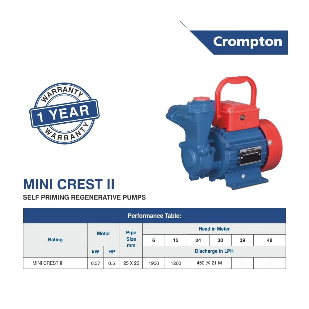 Crompton MINI CREST II Residential Water Pump Self Priming Regenerative 0.5 HP Single Phase